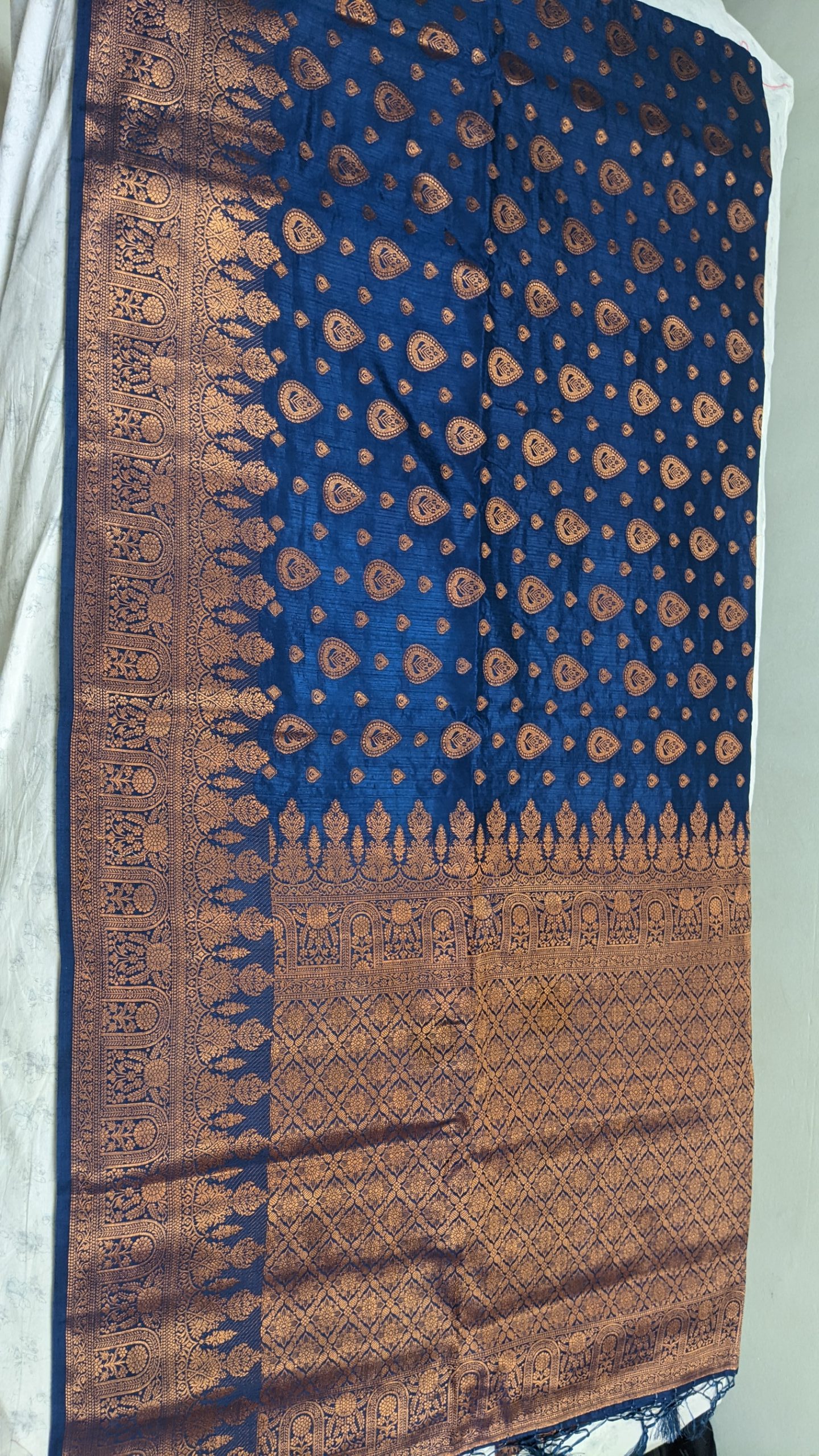 Do NOT soak/brush/ wash in washing machine/ twist the saree to remove water.